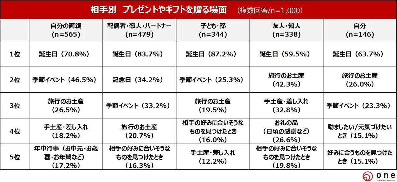 | マーケティング支援事業を手掛ける株式会社one(本社:東京都新宿区、代表取締役CEO:清水佑介)は、全国の10代~60代の男女1,000人を対象に「プレゼント・ギフトに関する調査」を実施しましたので発表いたします。 | ||||||||||||