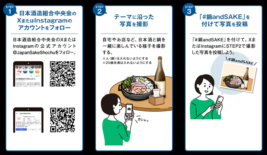 1.日本酒造組合中央会のXまたはInstagram公式アカウントをフォロー 2.テーマに沿った写真を撮影(自宅やお店など、日本酒と鍋を一緒に楽しんでいる様子を撮影) 3.ご自身のXまたはInstagramに2.の写真と「#鍋andSAKE」を付けて投稿 |