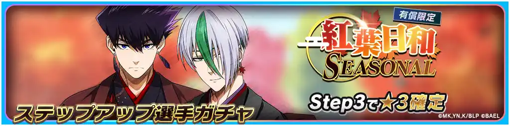 「<紅葉日和>ステップアップ選手ガチャ」に、【★3[紅葉日和]烏 旅人】と【★[紅葉日和]乙夜 影汰】が期間限定でピックアップされます。 |