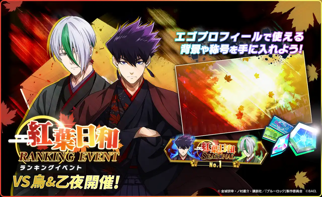 株式会社BAEL(本社:東京都新宿区、代表取締役:田村友一)は、TVアニメ『ブルーロック』を原作とするスマホゲーム『ブルーロック BLAZE BATTLE』(以下、ブレバト)にて、秋と紅葉をモチーフにした和装姿の【烏 旅人】と【乙夜 影汰】が新登場したことをお知らせします。