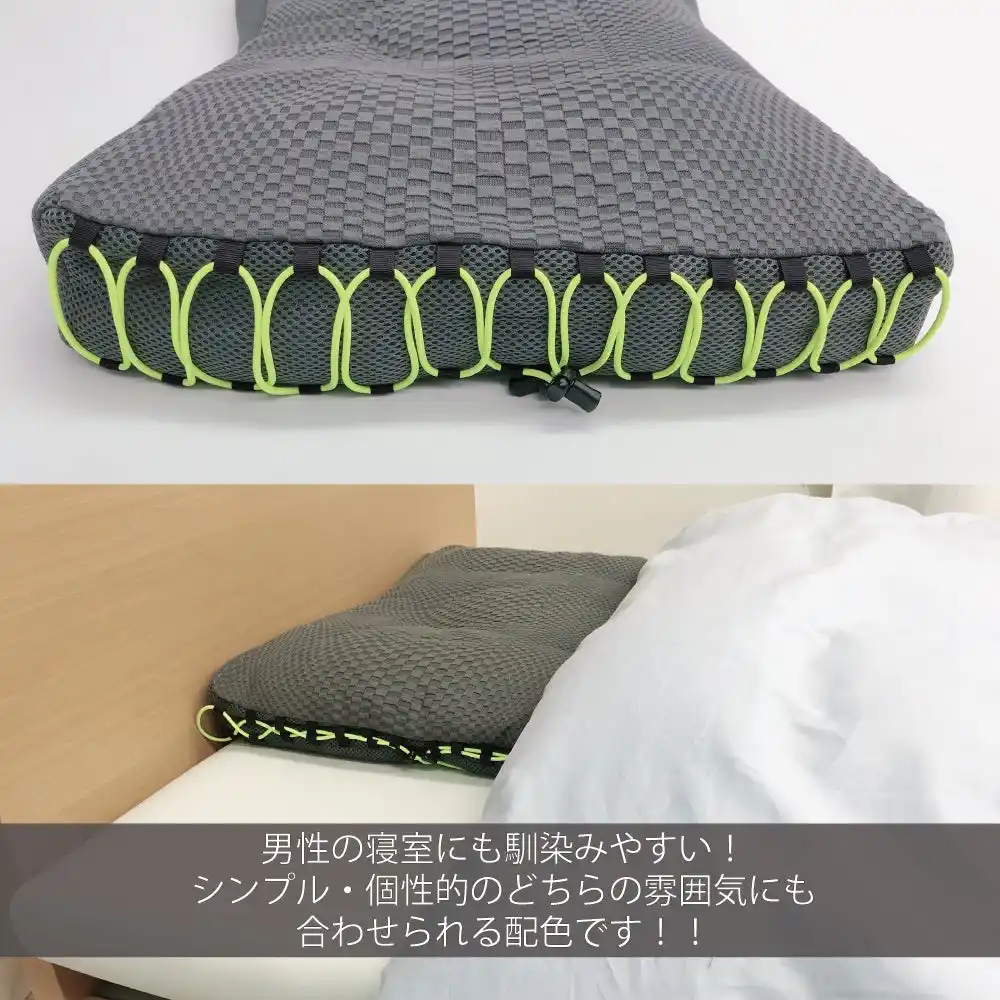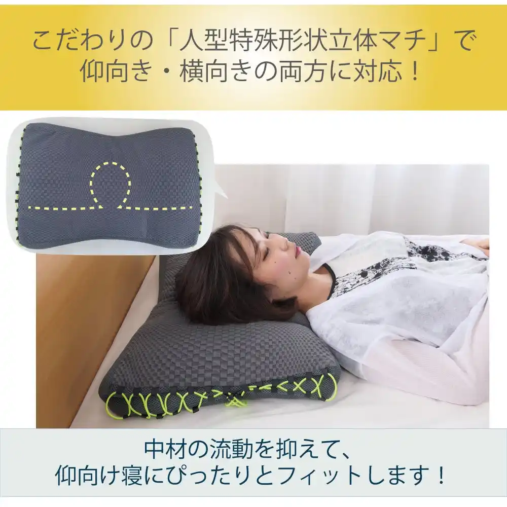 また、人型特殊形状立体マチや横寝をした際にも詰めものが逃げ難い立体マチなども採用されているため、それぞれの寝姿勢で最適な形状を維持出来る仕様のまくらとなっています。 |