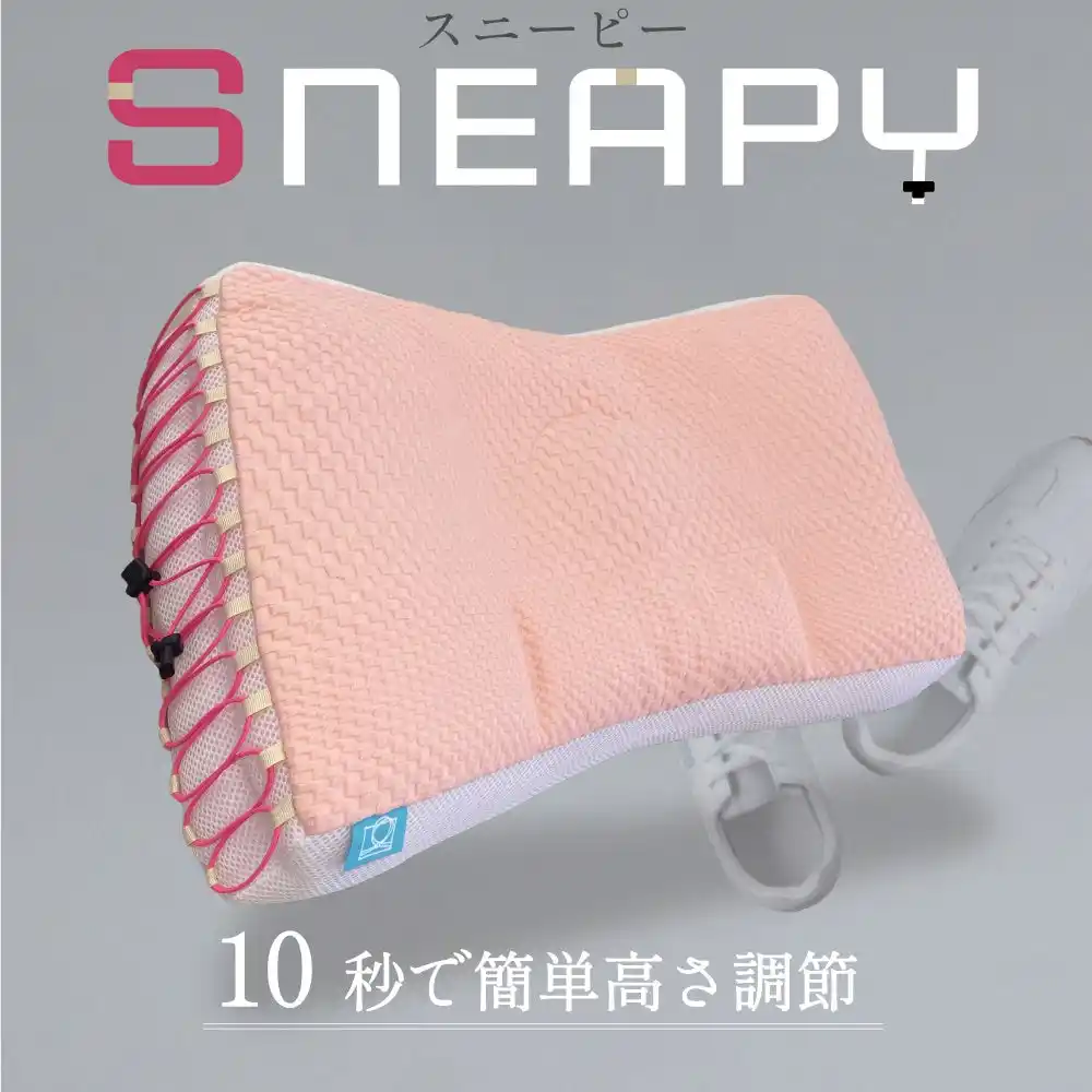 スニーカーをイメージして作られたスニーピーは横マチ部のドローコードを引っ張る事で簡単に高さ調節が出来る高機能まくらです。 |