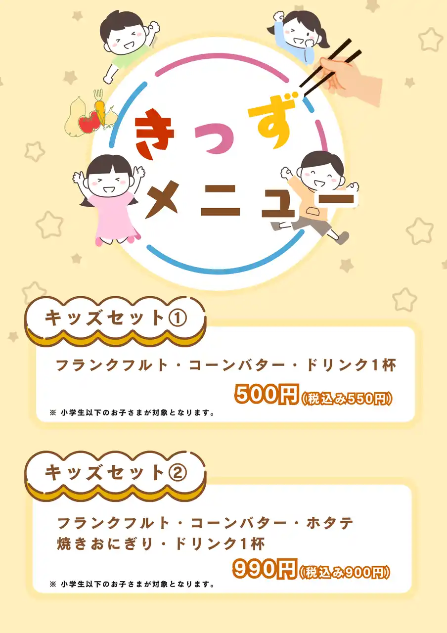 「家族みんなで牡蠣小屋を楽しんでほしい」 そんな想いから、「牡蠣小屋 かき太鼓」ではお子さまにも嬉しいキッズメニューをご用意しました。 |