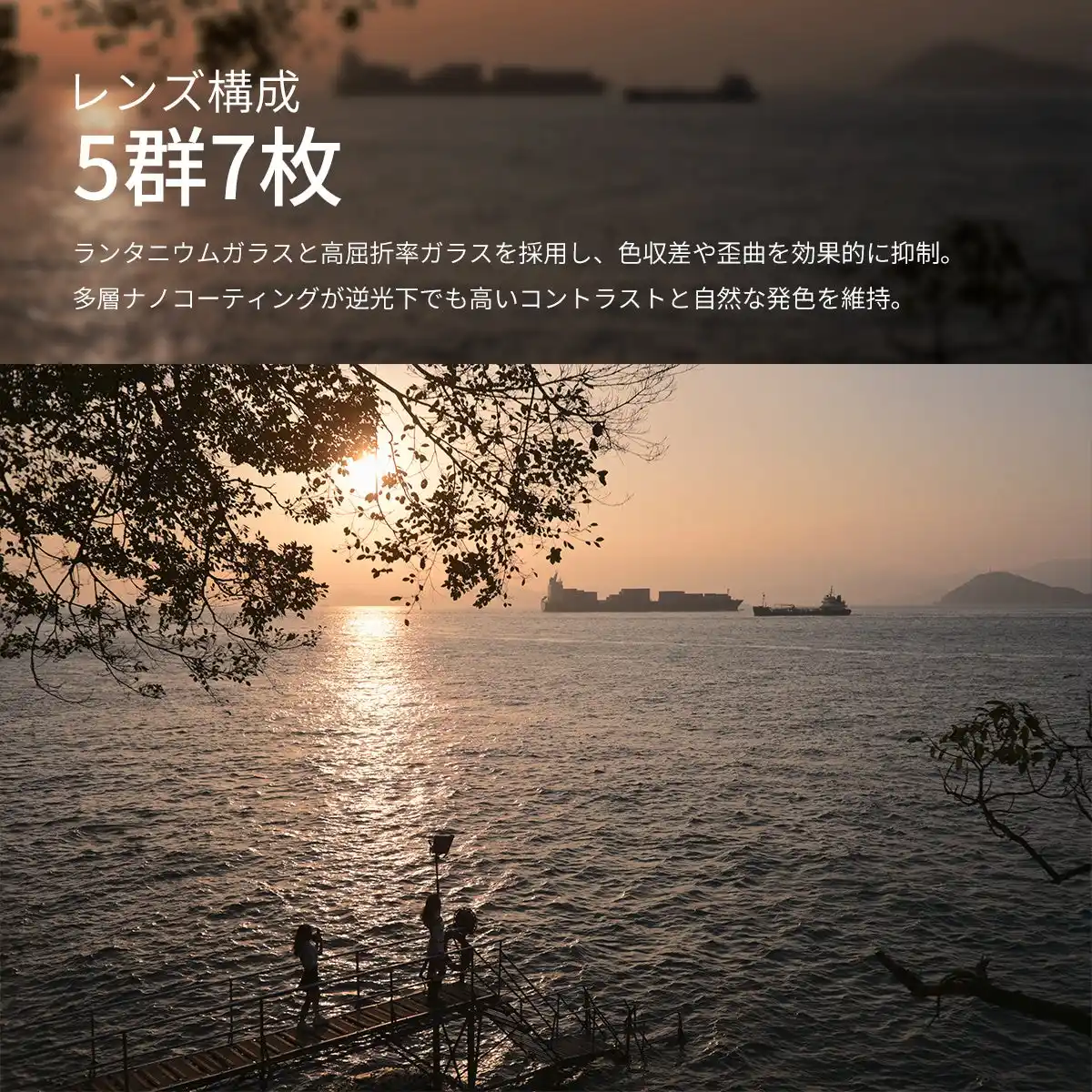 ランタニウムガラスと高屈折率ガラスを採用した5群7枚構成により、色収差や歪曲を効果的に抑制。多層ナノコーティングが逆光下でも高いコントラストと自然な発色を維持。 |
