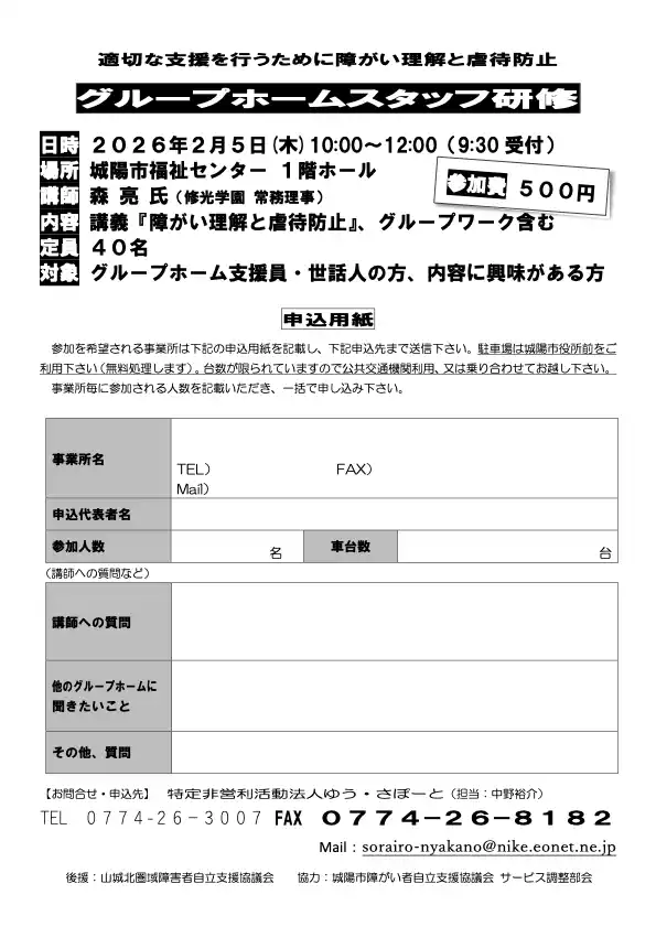 特定非営利活動法人ゆう・さぽーとは、城陽市障がい者自立支援協議会サービス調整部会の協力を受け、グループホームスタッフを対象とした研修会を2026年2月5日(木)に開催いたします。 |