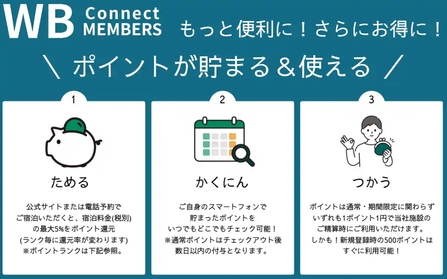 | 「WB Connect MEMBERS」は、ご予約いただいたご宿泊料金が会員ランクに応じて最大5%のポイントとして還元されるプログラムです。貯まったポイントは、次回以降のご宿泊時のお支払いに1ポイント=1円としてご利用いただけます。 | |||||||||||||||||