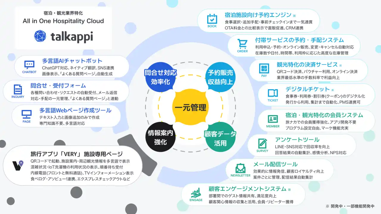 | 「talkappi」は、株式会社アクティバリューズ(本社:東京都渋谷区、代表取締役:陳 適)が宿泊施設や観光事業者向けに、問合せ対応・情報案内・会員管理・予約・決済など、ゲスト応対と施設運営に必要な機能をオールインワンで提供するクラウドサービスです。 | |||||||||||||||||