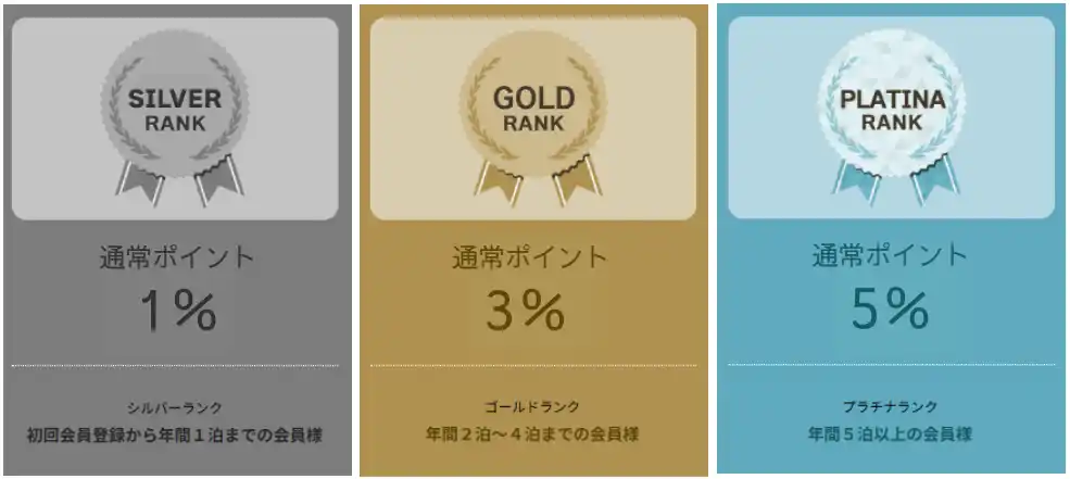 | 年間2泊すれば、ゴールド会員へアップ、5泊以上でプラチナ会員になる為大変ランクアップしやすい設定になっています。 | |||||||||||||||||