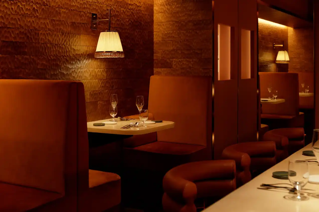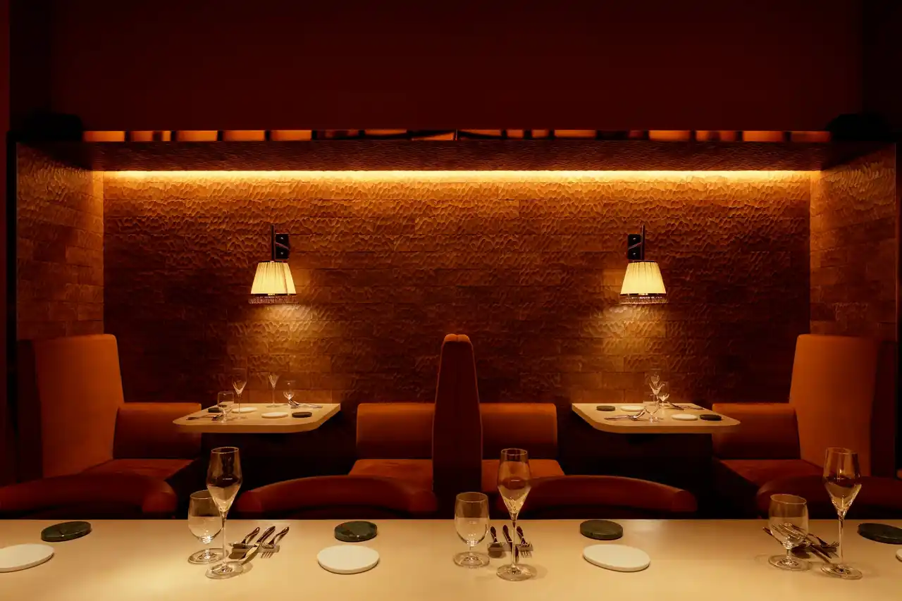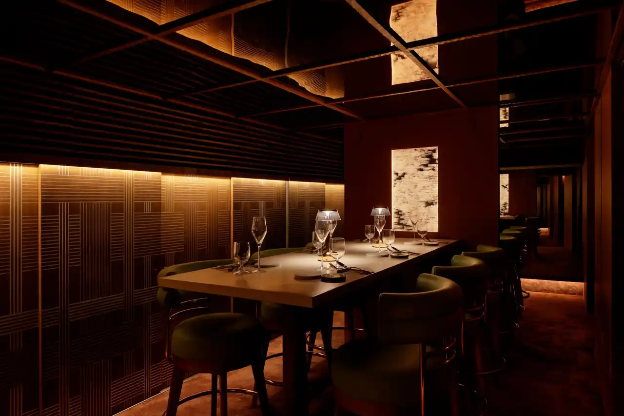 店内は温かみのあるライティングに包まれた、ライブ感あふれるオープンキッチンのダイニング空間としています。一見“洋”の雰囲気を持ちながらも、大正時代から続く結晶ガラスの飾り棚や、料理が供される天板に用いた左官仕上げなど、随所に日本の伝統的な素材と技術を取り入れています。 |