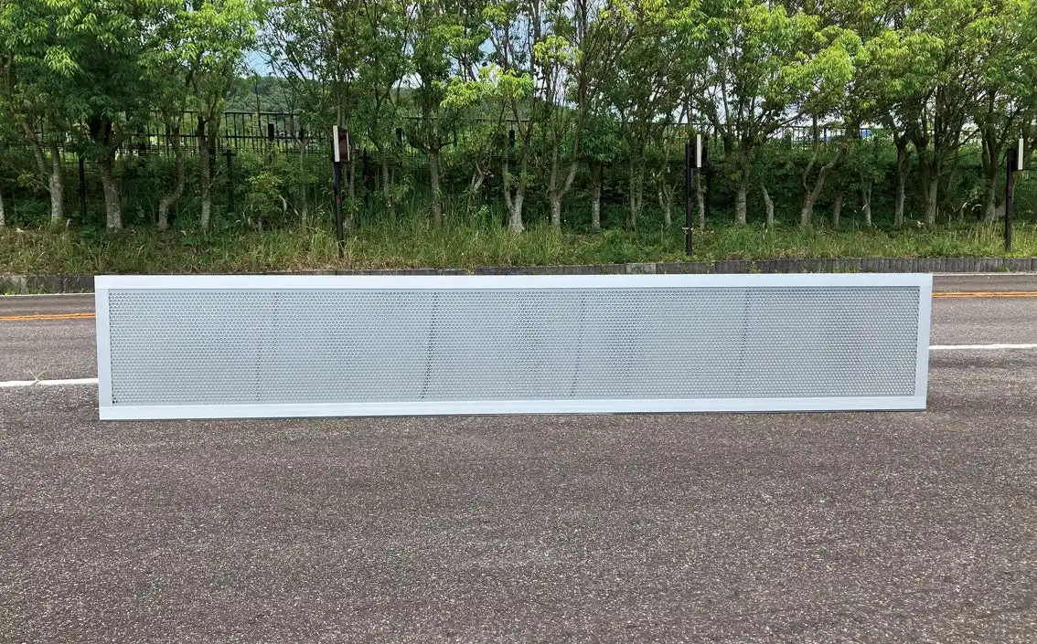 遮音壁の先端に設置することで、標準的な吸遮音板を設置した場合と比較して、約2dB騒音低減効果を増大させる製品です。本製品の設置により、従来の遮音壁を+1.5~2.0m嵩上げした場合と同様の騒音低減効果が得られるため、遮音壁を設置する構造体の強度が不足しており、高遮音壁の設置が出来ない場合に有効です。 |