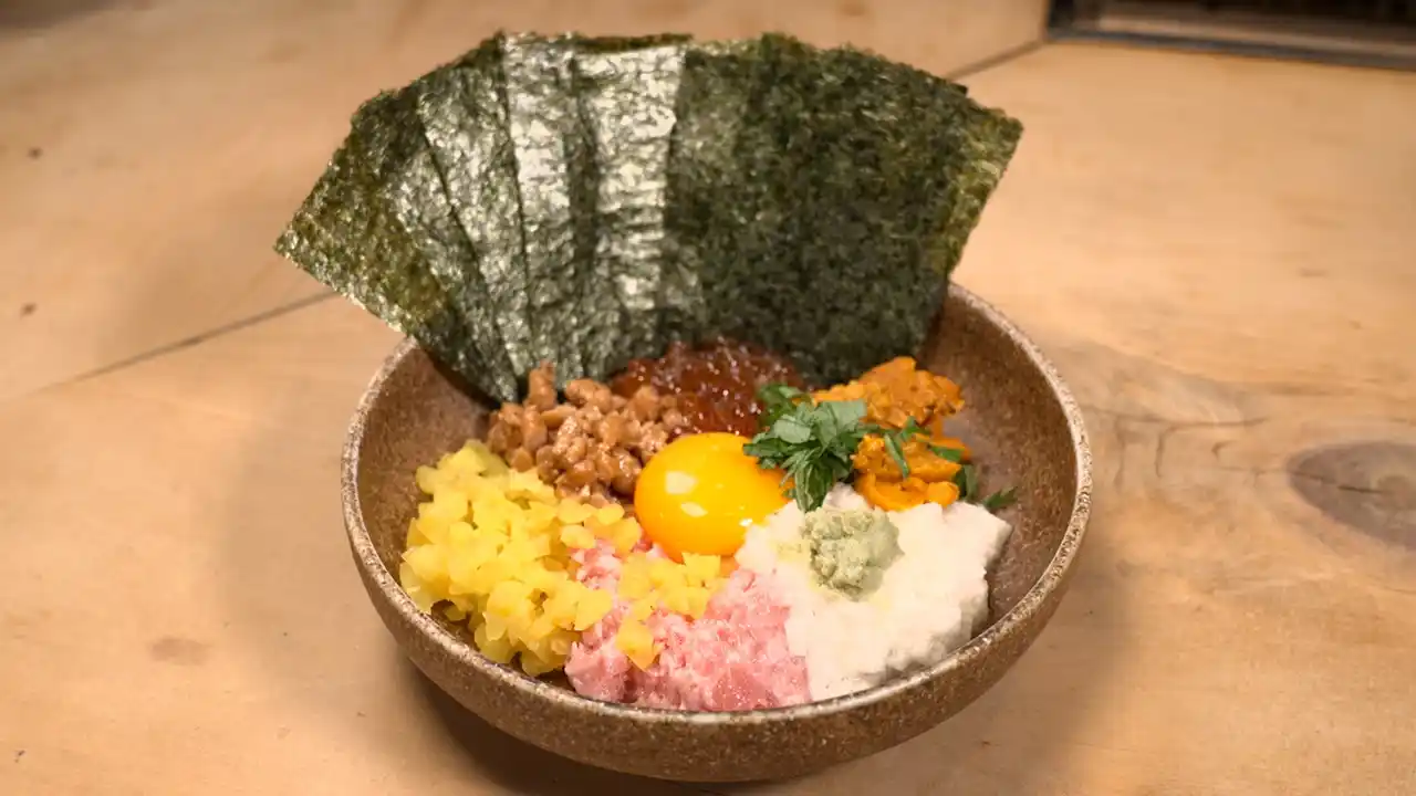 ご飯の上にウニ、イクラ・中落ちマグロ、たくあん、南東、長芋、大葉、卵黄、ワサビが乗った贅沢な「ばくだん」。そのばくだんに込められた店主の想いとは? |