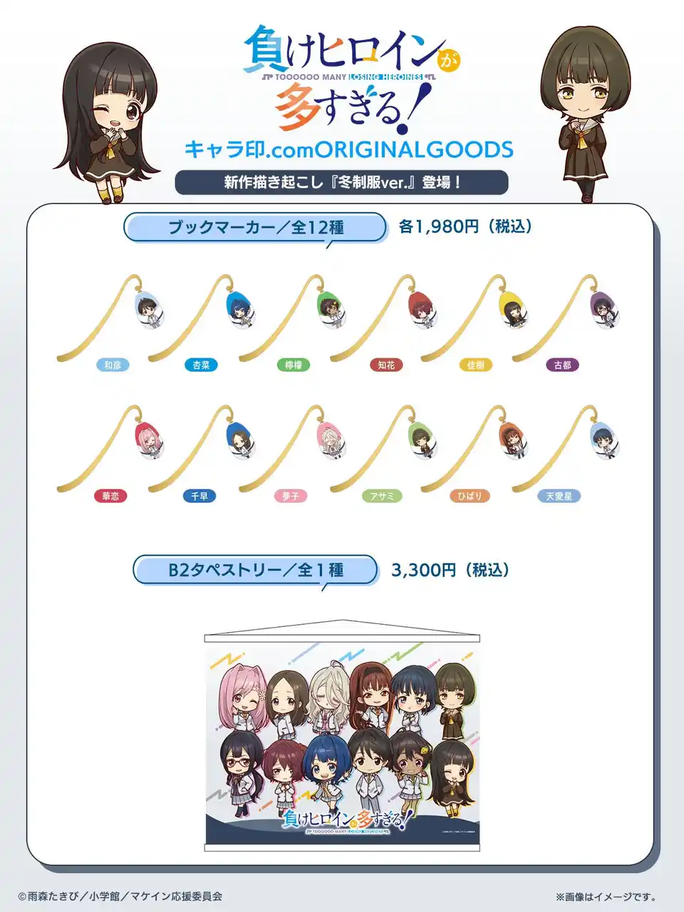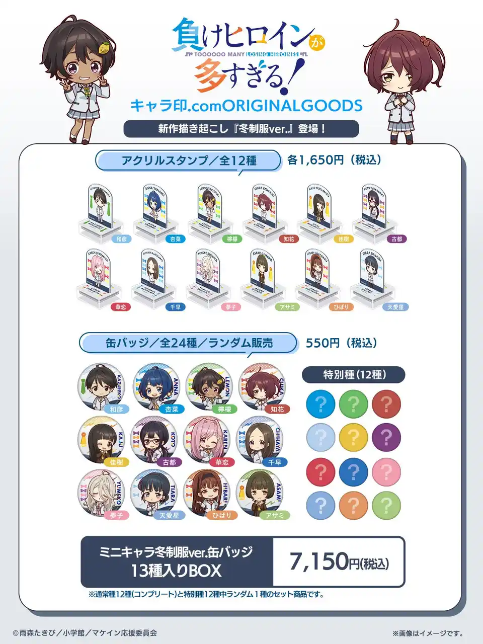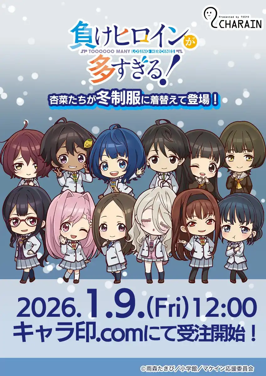 TVアニメ『負けヒロインが多すぎる!』のファン必見!この度、99種に及ぶキャラ印.comオリジナル新グッズの発売が決定いたしました!おなじみの夏制服ミニキャライラストから一新、冬制服に衣替えしたミニキャライラストの八奈見杏菜たちが登場します。さらに精文館書店限定のミニキャライラストグッズもラインナップ!これらの新グッズは、全国の精文館書店36店舗にて、先行&限定販売されることが決定!いち早く、そしてここでしか手に入らないアイテムを手に入れるチャンスをお見逃しなく! |