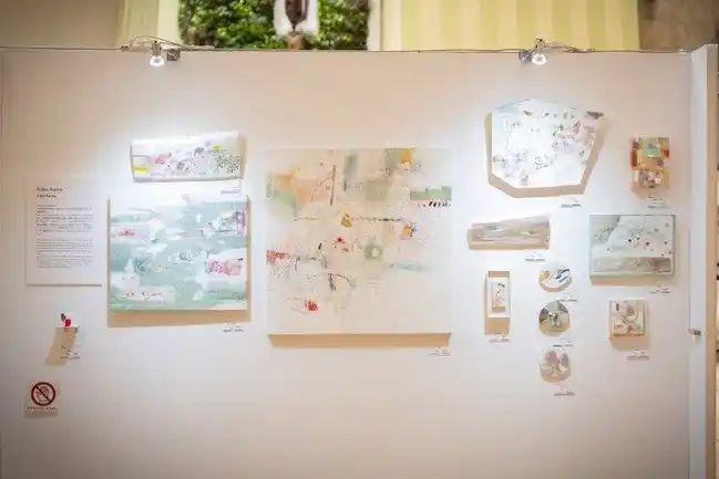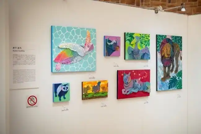 また、井下 彩乃さん、イユダ エマさん、ピトさん、MINAMI MIYAJIMAさんはデザイン学科、山田紗世さんは大阪芸術大学短期大学部デザイン美術学科出身。動物の半立体アート、可愛いポップな作風の中にダークさがひそむ作品、ラメやアクリル絵の具でリズミカルに描いたカラフルなアート、四角形が密集する幾何学的なモノトーン作品、手彩色を加えたシルクスクリーンなど、多彩な技法が会場に華やぎを添えていました。 |