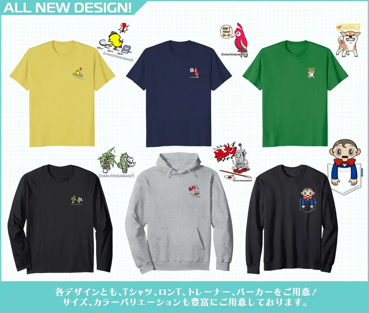 「逆転裁判123 成歩堂セレクション」の個性豊かなサイドキャラクターをピックアップした新作デザインが登場! 可愛くデザインされたキャラたちを普段使いしてもらえるように、小さく胸元にプリントしました。半袖Tシャツはもちろん、ロンT、トレーナー、パーカーのお好きなタイプからお選びいただけます。今すぐチェック! |
