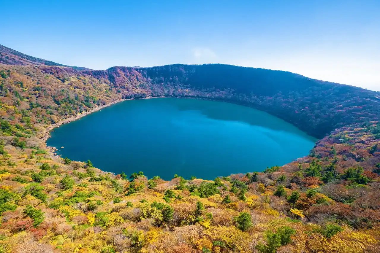 標高1,411mに位置する「大浪池」。山頂には周囲1.9km、水深11mの火口湖があり、湖の周囲が鮮やかな赤や黄色に染まります。 |