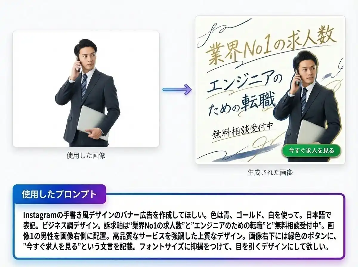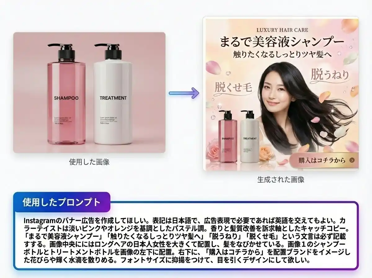 | 本アップデートにより、「AI Workspace」の画像編集機能において「自然な日本語の文字入れ」が可能となり、素材生成からバナーデザインの完成までを、ツール内で完結させることができます。 | ||||||||||||