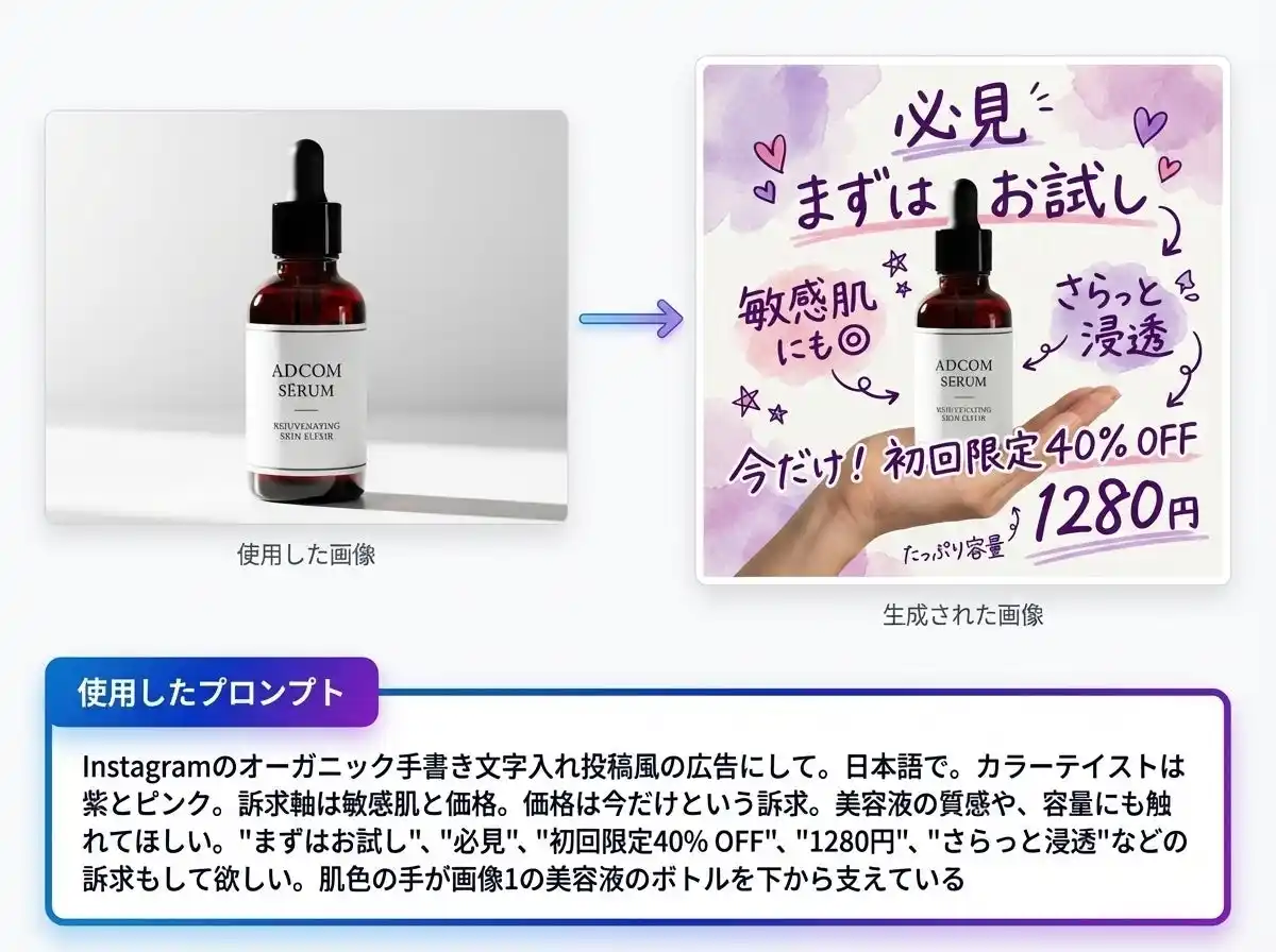 | 今回、Googleの最新モデル「Nano Banana Pro」を実装することで、日本語テキストの描写精度が飛躍的に向上しました。 これにより従来の課題を解決し、アド.com上で以下のフローをシームレスかつ高品質に行えるようになりました。 | ||||||||||||