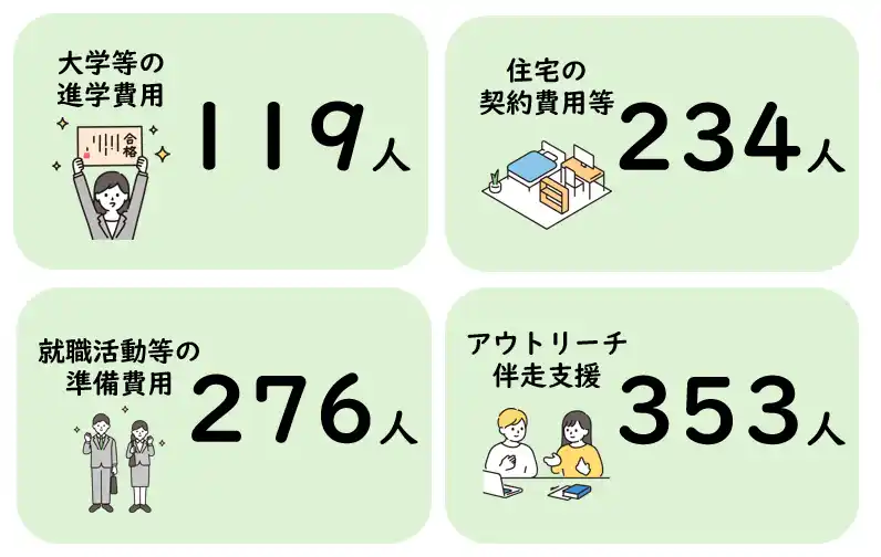 ・就職や進学など将来のことを話すことが難しかったが、「支援金があるよ」と声をかけ、将来のことを話し合うことができました。 ・伴走支援の費用補助があり、相談や手続きに同行したり買い物ができました。若者たちと共に動くことで信頼関係が築くことができました。 ・通年事業なので、若者たちが自立に向けて動き出すタイミングで、声をかけたり支援をすることができ、本当に有難かったです。 |