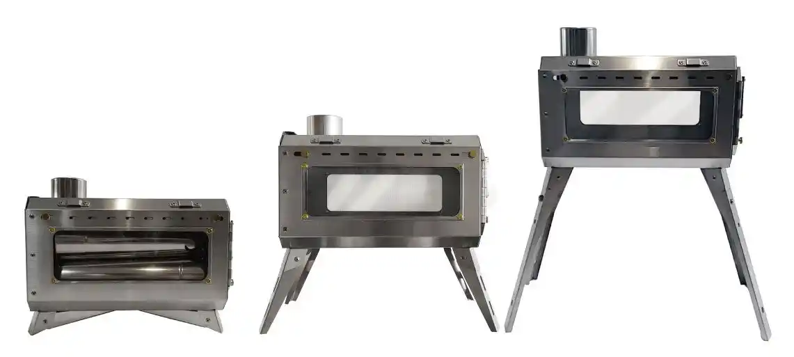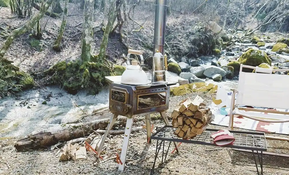 キャンキャンパーの「焚き薪ストーブ」は脚をペグで固定でき、砂利・雪・土などさまざまなサイトに対応します。 |