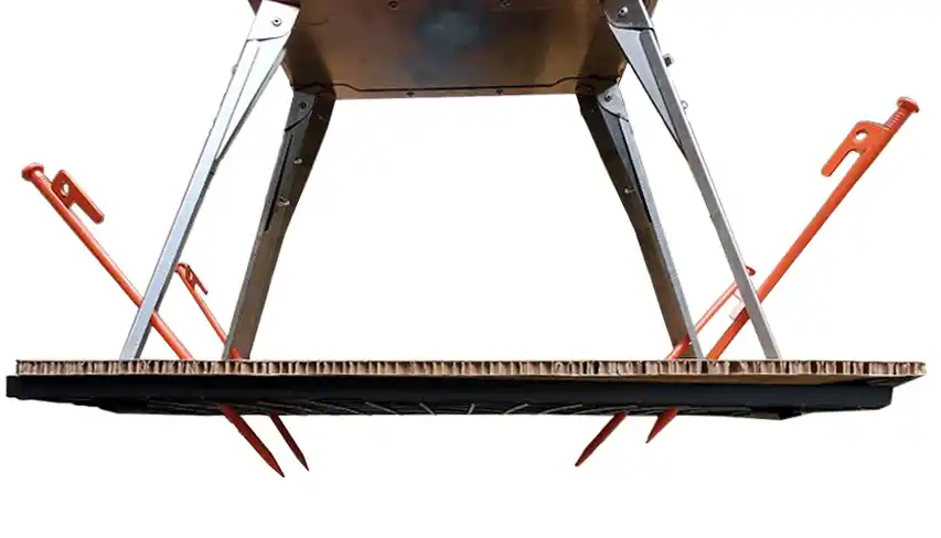 最大の特徴は脚部をペグで固定する独自構造です。夜間はガイロープなどに足を引っ掛ける危険があり、火を扱いながらのファミリーキャンプは、常に子どもの動きをチェックしつつ、火元の安定性を確保しなければいけません。「焚き薪ストーブ」のペグ固定方式なら導線を確保しやすく、ロープが緩む心配もありません。 |