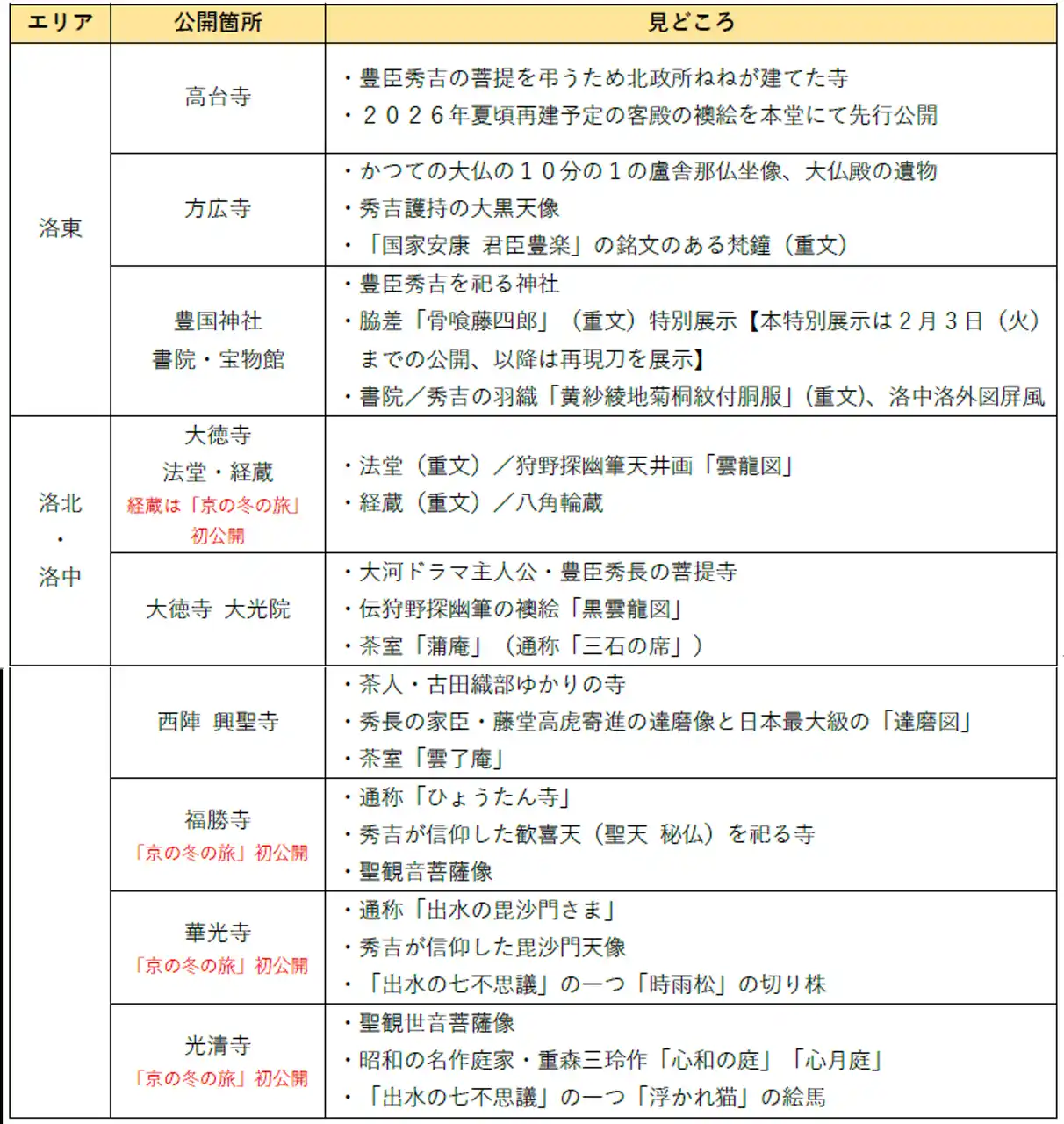 1967年1月に始まった本企画は、2026年に第60回を迎えます。今回は、大河ドラマ「豊臣兄弟!」の主人公・豊臣秀長と兄・秀吉ゆかりの地をテーマに、15件の貴重な非公開文化財を特別公開します。また、定期観光バスやタクシーで巡る特別コースのほか、京都の歴史や文化をより深く楽しめる体験プラン、60回記念の特別企画など、多彩で充実した内容で展開します。 |