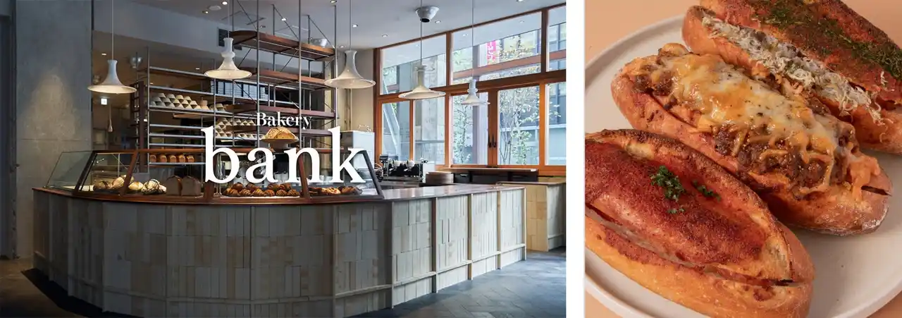 Bakery bank(ベーカリーバンク): 日本橋兜町に誕生した食の複合ショップ「BANK」の1Fにあるベーカリー。提供されるパンは、水分量と粉の種類、製法にこだわることで生み出される独特の食感が特徴です。 |