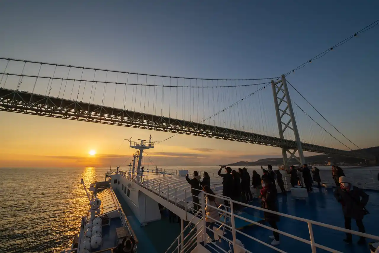 当日は早朝5時50分に神戸港を出港。 世界最大級の吊り橋「明石海峡大橋」へ向けて航行し、橋の真下をくぐるダイナミックな瞬間と、水平線から昇る初日の出の絶景を船上で体感いただけます。 |
