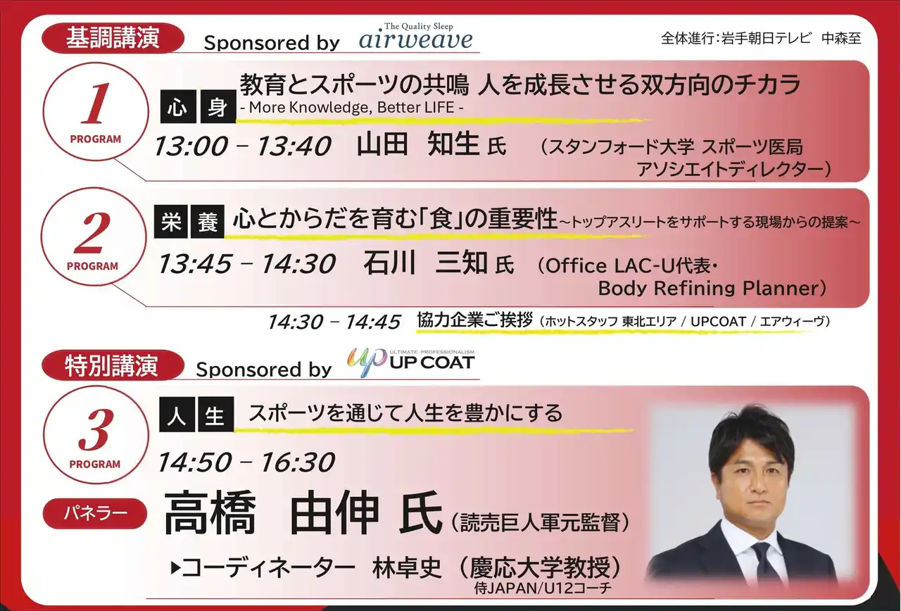 世界で活躍するメジャーリーガーや、スタンフォード大学の野球部で活躍中の佐々木麟太郎選手などを輩出している岩手県で開催されるこのカンファレンスは、「未来を創る子どもたち スポーツ・教育・思考のグローバルシフト 」と題し、日本で暮らす多くの子どもたち、保護者、指導者の皆さまへ、質の高い知見と情報をご提供いたします。 |