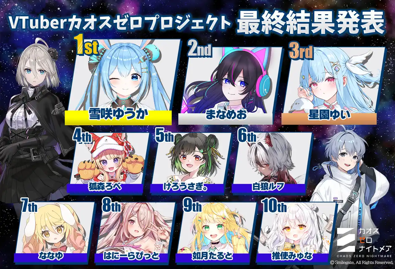 カオスゼロナイトメアの正式リリースに合わせ10月21日に開幕した「VTuberカオスゼロプロジェクト」は、11月3日に堂々のフィナーレを迎え、ついに最終結果が発表されました。熾烈な争いを制した雪咲ゆうかさんが見事優勝に輝き、続いてまなめおさんが2位、星園ゆいさんが3位にランクイン。さらに狐森ろべさんが4位、けろうさぎ。さんが5位と続き、最後まで目が離せない熱戦となりました。 |
