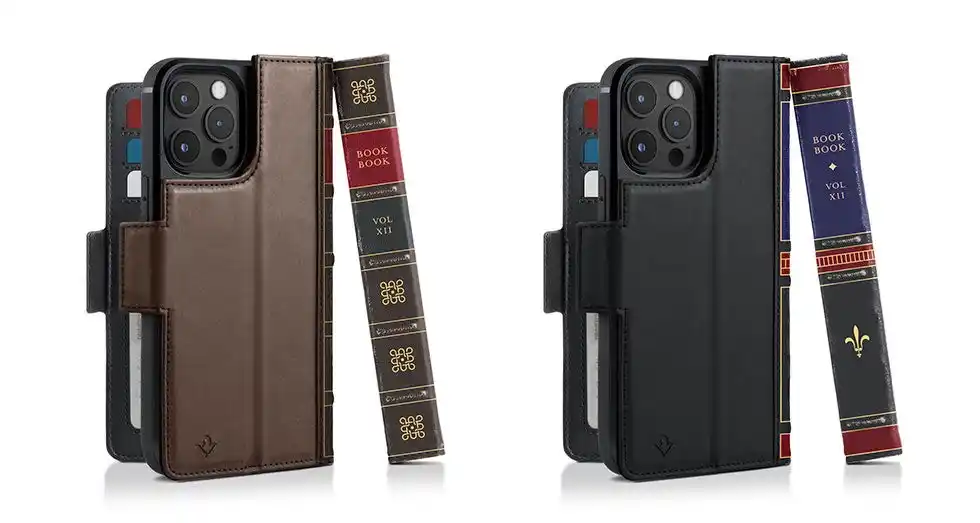 MagSafe充電器対応のiPhone15シリーズ用フルグレイン本革レザーケース、ヴィンテージ洋書風ハードカバーはリアル財布機能搭載、そして折りたたみ式ディスプレイスタンドに変形。ブラウン、ブラックの2色展開。 |