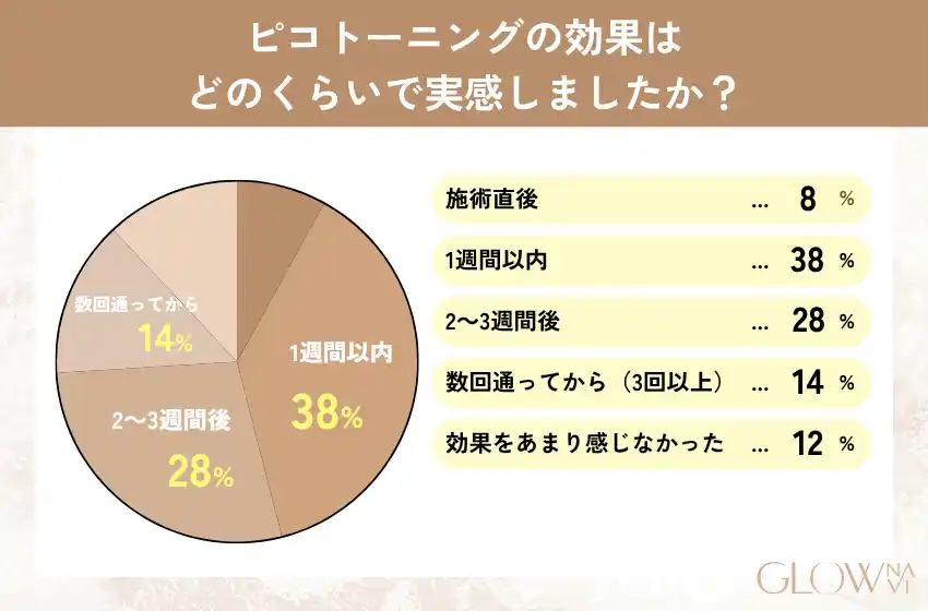 「1週間以内に実感した」38% が最多。 また 「2~3週間後」も28% と、施術後すぐ~数週間で変化を感じる人が多数派でした。 複数回通ってから実感した(14%) という人もおり、ピコトーニングの「継続で効果が積み重なる」特徴が反映された結果となっています。 |