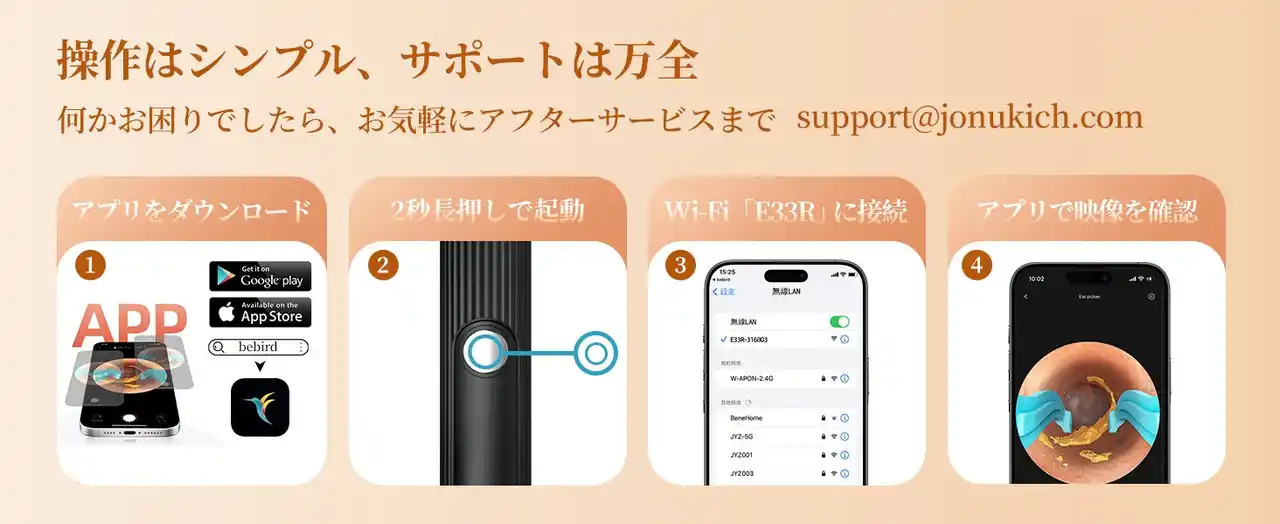 2.4GHz高速WiFiにより、スマホやタブレットにスムーズ接続。iPhone / Android / iPad すべてに対応しています。 アプリを開くだけで耳の中がリアルタイム映像で表示され、録画・スクリーンショット・左右反転などの機能も簡単操作。 6軸ジャイロセンサーによる手ブレ補正で、細かな動作も安定して観察できます。 |