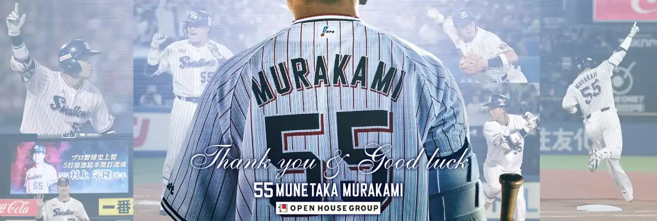 株式会社オープンハウスグループ(本社 東京都千代田区、代表取締役社長 福岡良介、以下「当社」)は、当社のパートナーアスリートで、海外挑戦を目指す東京ヤクルトスワローズ(以下「スワローズ」)・村上宗隆選手をファンの皆様と後押しするため、村上選手への思いが詰まった投稿を募集するSNSキャンペーン「村上宗隆選手応援企画 世界に届け!#WE_LOVE_MUNE」(以下「本キャンペーン」)を2025 年11月22日(土)午前10時より開始いたします。特別賞品も用意し、ご参加いただいた方から抽選で、プレゼントいたします。また、当社は、スワローズが11月23日(日)のファン感謝デーで、ファンの皆様から村上選手への感謝と応援の気持ちを手書きしたメッセージを集めて、村上選手の巨大ビジュアルに貼る「村上選手メッセージ企画」(以下「本企画」)に協賛いたします。本キャンペーンおよび本企画を通じて、村上選手の挑戦を熱く応援します。