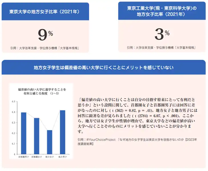 それから1年半が経ちましたが、依然として東京大学の女子学生比率は約2割、そのうち地方出身の女子比率はわずか8%に留まっています。 |