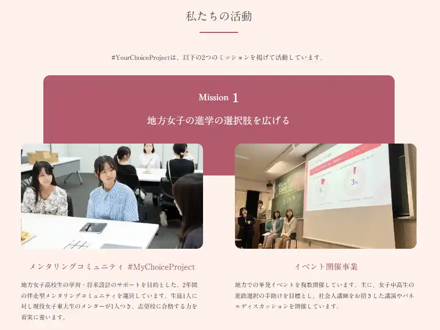 「全ての学生が、生まれついた地域や生まれ持ったジェンダーに関わらず自由な進学選択・キャリア選択ができる社会」を目指しており、2つのミッションを掲げ活動をしています。 |