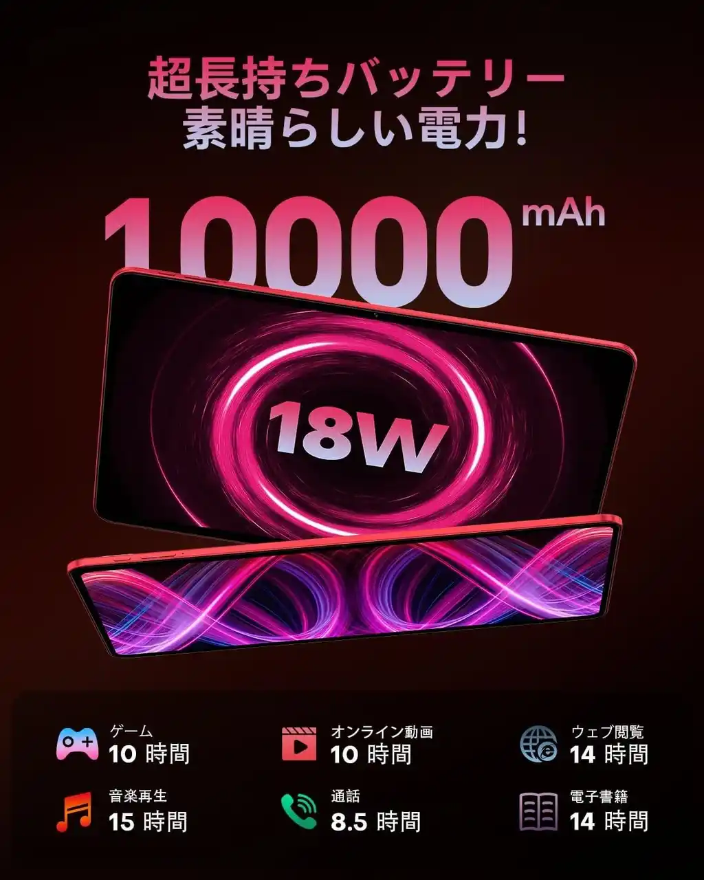 【120Hz、13.4インチ大画面、1920×1200解像度、Widevine L1、ワイヤレス投影】13インチタブレット TECLAST T65Plus は、10インチに比べ約76%広いスクリーンエリアを実現し、1920×1200の高精細解像度と120Hz高リフレッシュレートを備えた IPS FHD 液晶が、映像鑑賞からゲーム操作まで多様なシーンで魅力を発揮します。 |