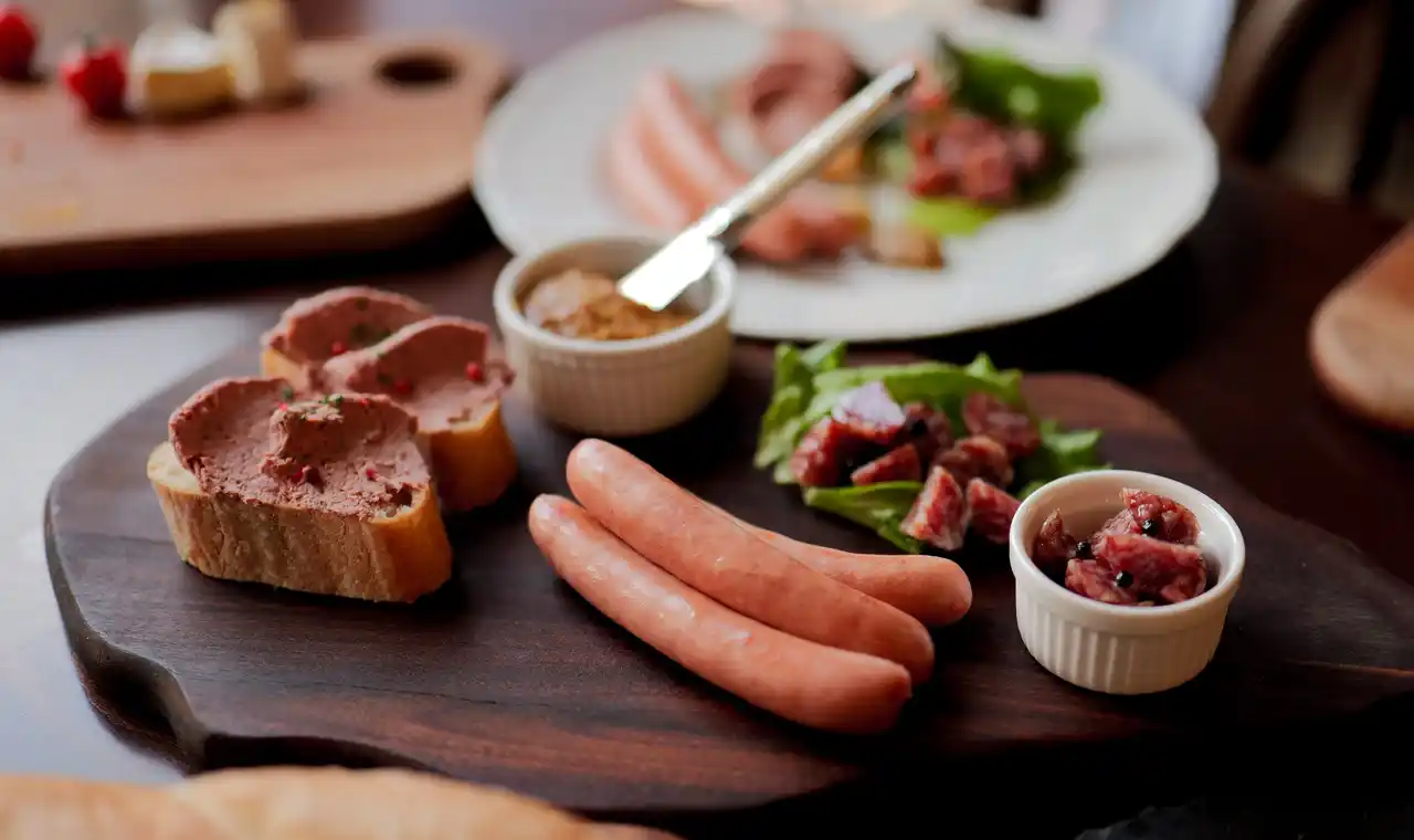 ニンニクソーセージ:パンチの効いた風味が癖になる一品。 |