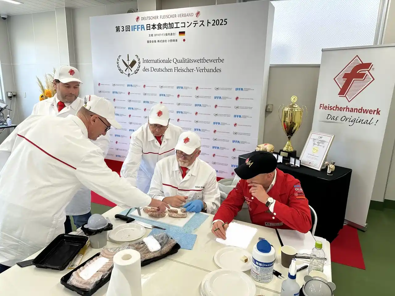 今回のコンテストは、3年に一度開催される食肉業界のオリンピックとも称される権威ある大会です。本来ドイツ・フランクフルトで開催される予定でしたが、防疫上の理由等により日本での開催となりました。 しかし、審査員はドイツから来日した7名のマイスターたち。審査基準はドイツ本国と全く同じ「絶対評価」で行われました。 |