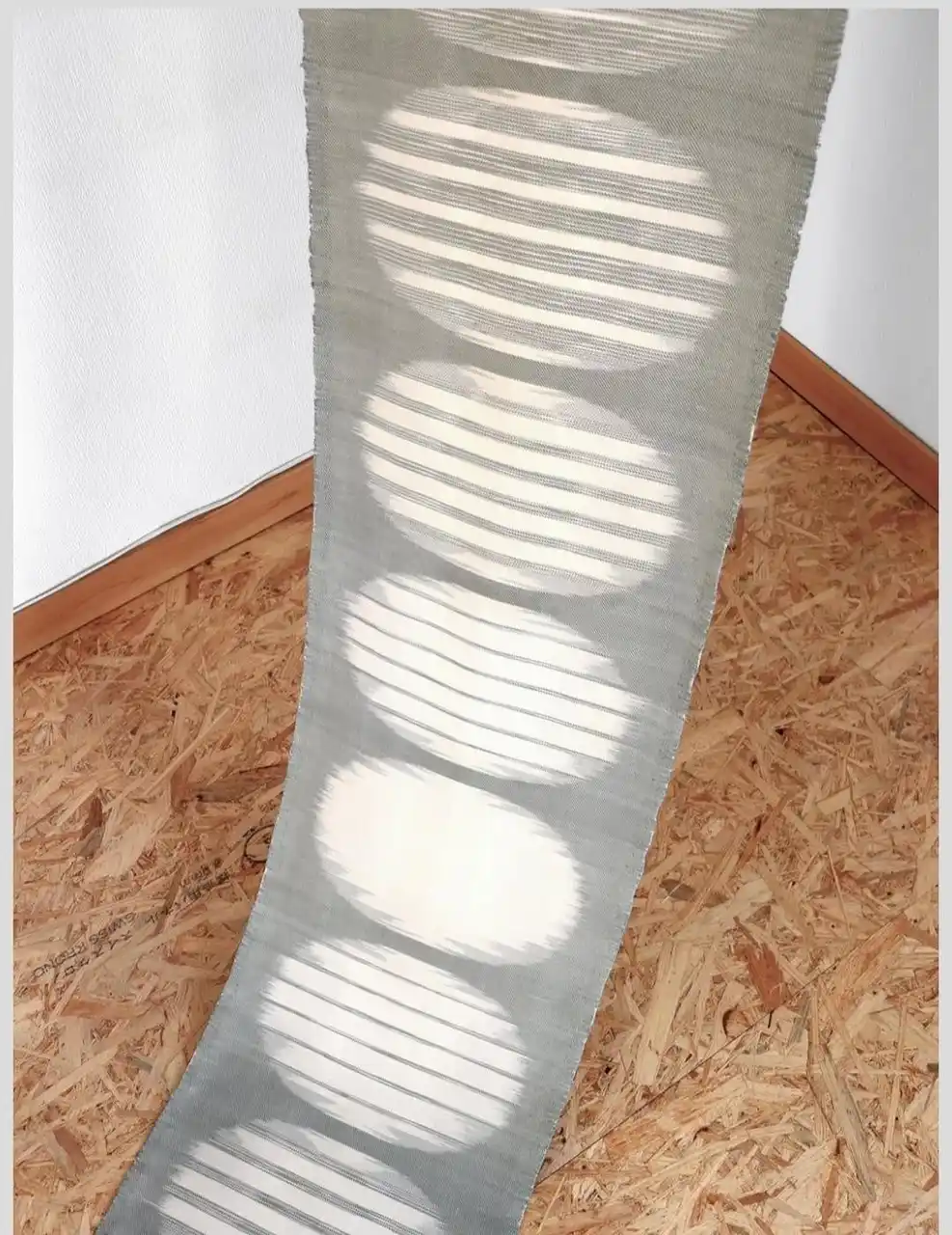 絣織の技法の仕組みに着目し、テキスタイルの制作を行う。あらかじめ防染し染め 分けた糸を用いて文様を織り出す伝統的な絣織技法を扱い、その手法の制約の中で 生まれる色・かたち、特有の視覚的効果によって文様を描くことを探求している。 2024年多摩美術大学大学院美術研究科博士前期課程デザイン専攻テキスタイルデザ イン研究領域修了。 |