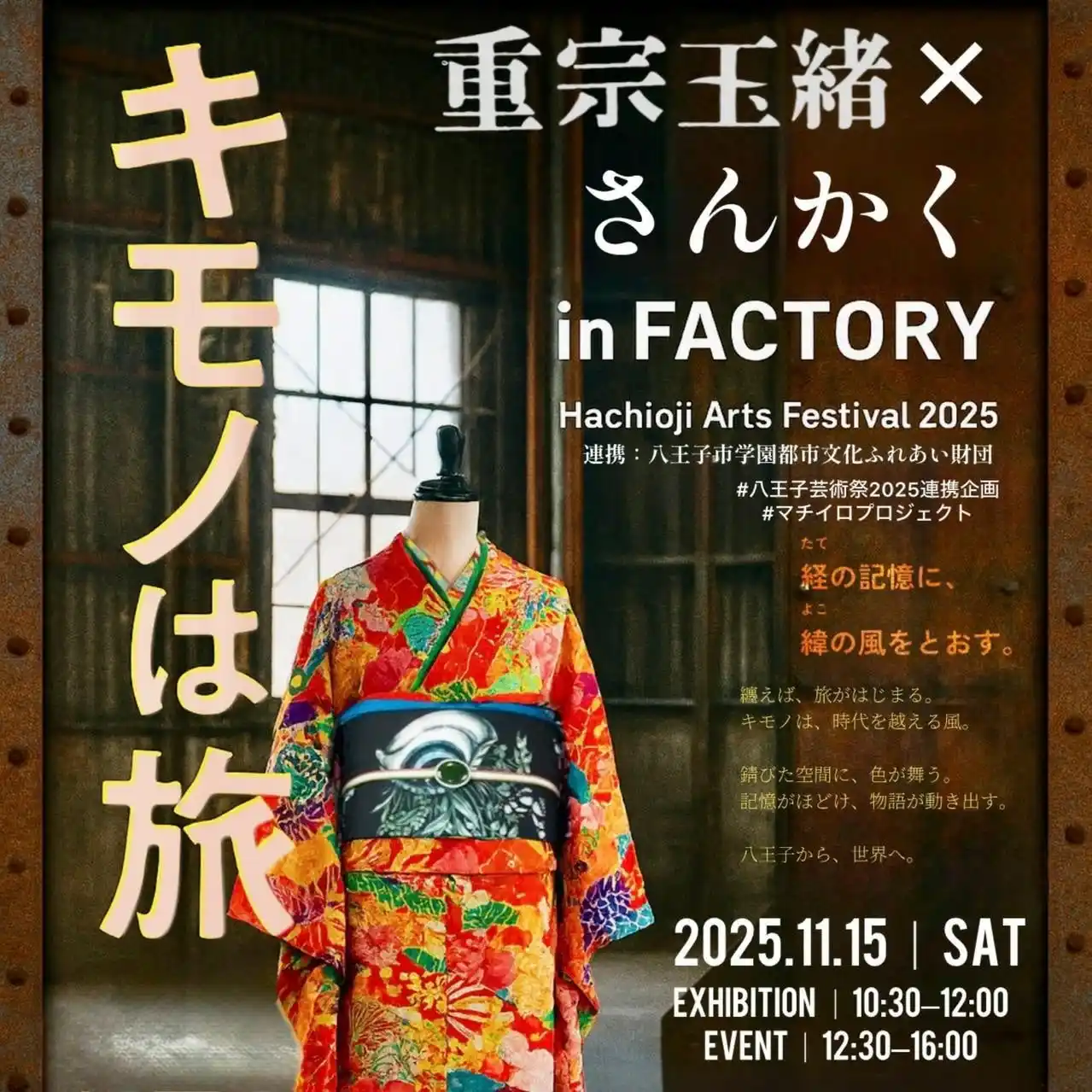 重宗玉緒 × さんかく in FACTORY (11月15日@ファーストライブ八王子スタジオ) 旧鉄鋼工場を舞台に開催される特別なイベント。 現代キモノの革新者・重宗玉緒さんとさんかくさんによるトーク&展示を通して、色彩と物語が交差するキモノを巡る“旅”を八王子から世界へ発信します。 |