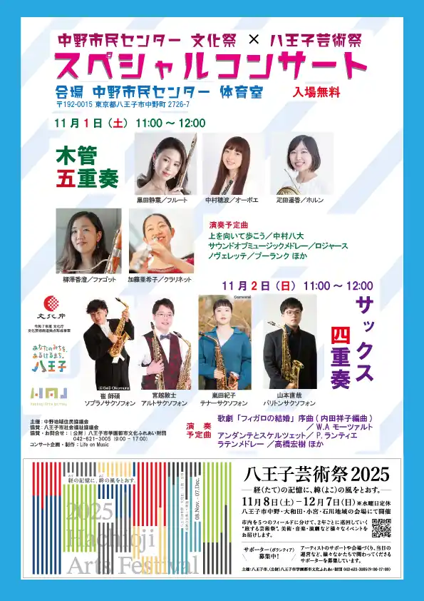 (10月5日@セレオ八王子北館9F セレオガーデン) 有志メンバーが、芸術祭の一環としてセレオ八王子や地域イベントに登場します。若い世代ならではのエネルギーと瑞々しい感性あふれる演奏で、街の空間を彩ります。 |