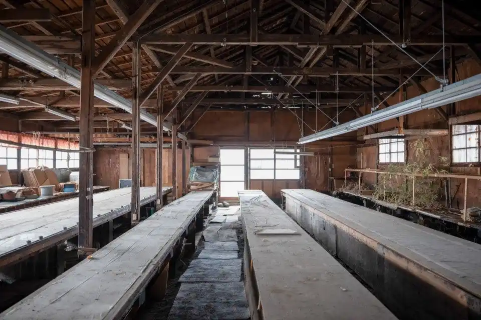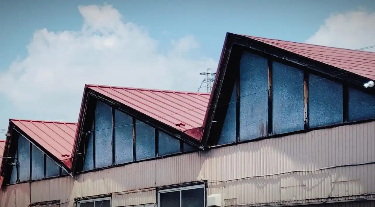 織物工場の特徴的な三角屋根(のこぎり屋根) 自然光を一定方向から取り入れ、織物作業に最適な光環境をつくり出していました。職人の手元に柔らかな自然光を届ける、知恵のかたちが現在も見られます。