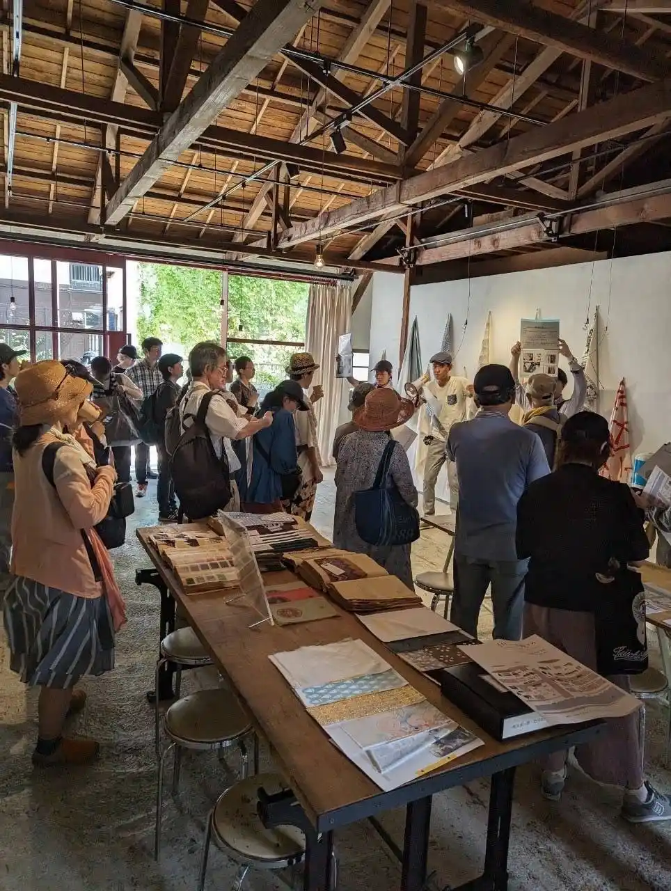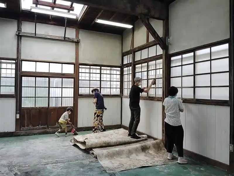 織物工場跡。芸術祭メイン会場。美術展示のほかに、地域の職人さんやお店とコラボレーションをして制作した、公式グッズの販売なども行います。作家さんや地域の方とお掃除している様子。 |