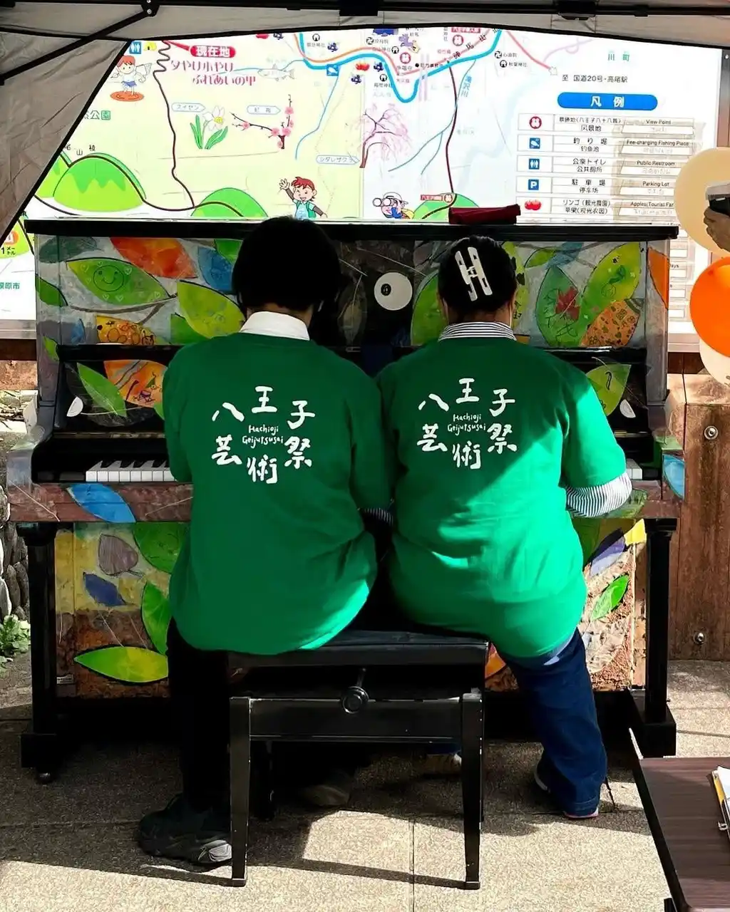 2023年開催 第1期八王子芸術祭でのサポーターさんの様子。使われなくなったピアノに子どもたちとアートワークショップをして生まれ変わった、アートピアノを弾いているところ。 |