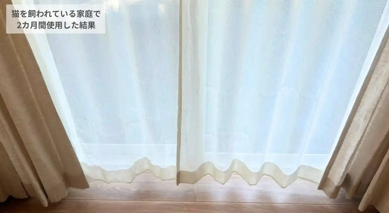 猫を飼っていて、以前のレースカーテンは裾がボロボロに…。買い替えたいけど、おしゃれなペット対応カーテンがなかなか見つからず困っていました。そんな中でこのカーテンを使ってみたところ、引っかき傷がついても手でくしゅくしゅと揉むと目立たなくなるので、本当に助かっています!完全に元通りではないですが、以前に比べて断然気になりません。 |