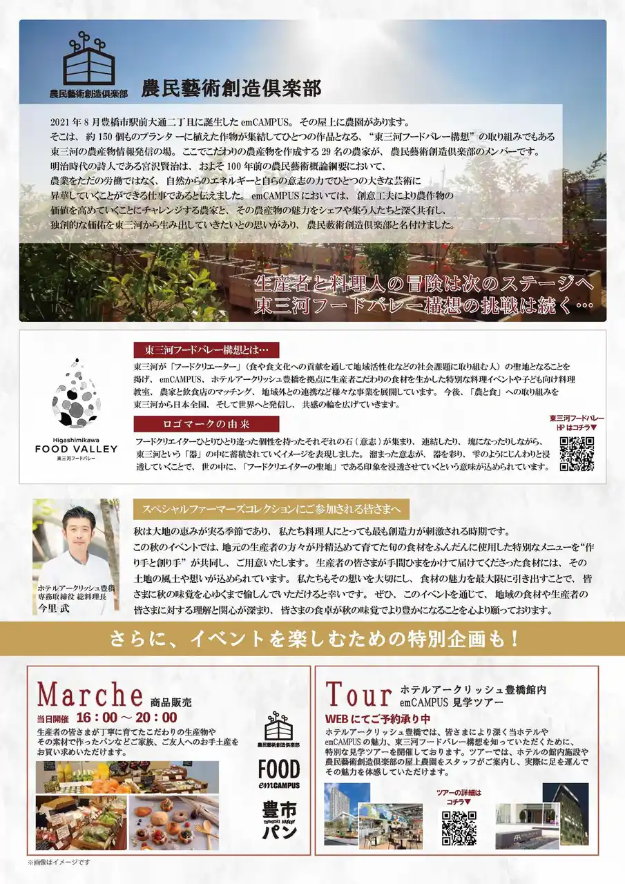 ホテルアークリッシュ豊橋(サーラ不動産株式会社)は、東三河フードバレー構想(下記参照)の実現に向けた取り組みのひとつとして、農民藝術創造倶楽部とともに、特別企画「SPECIAL FARMERS COLLECTION AUTUMN 2025」を2025年11月16日(日)に開催いたしました。 |