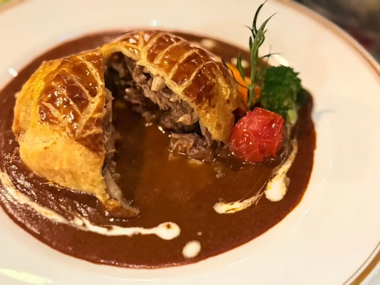 メインには、やわらかく煮込んだ信州和牛ほほ肉をパイで包み、香ばしく焼き上げ濃厚なシチューソースとともにお楽しみいただけます。 またデザートのブッシュドノエルは、地元・芋井地区の名産であるじゃがいもとりんごを使った、やさしい甘さのデザートです。 |