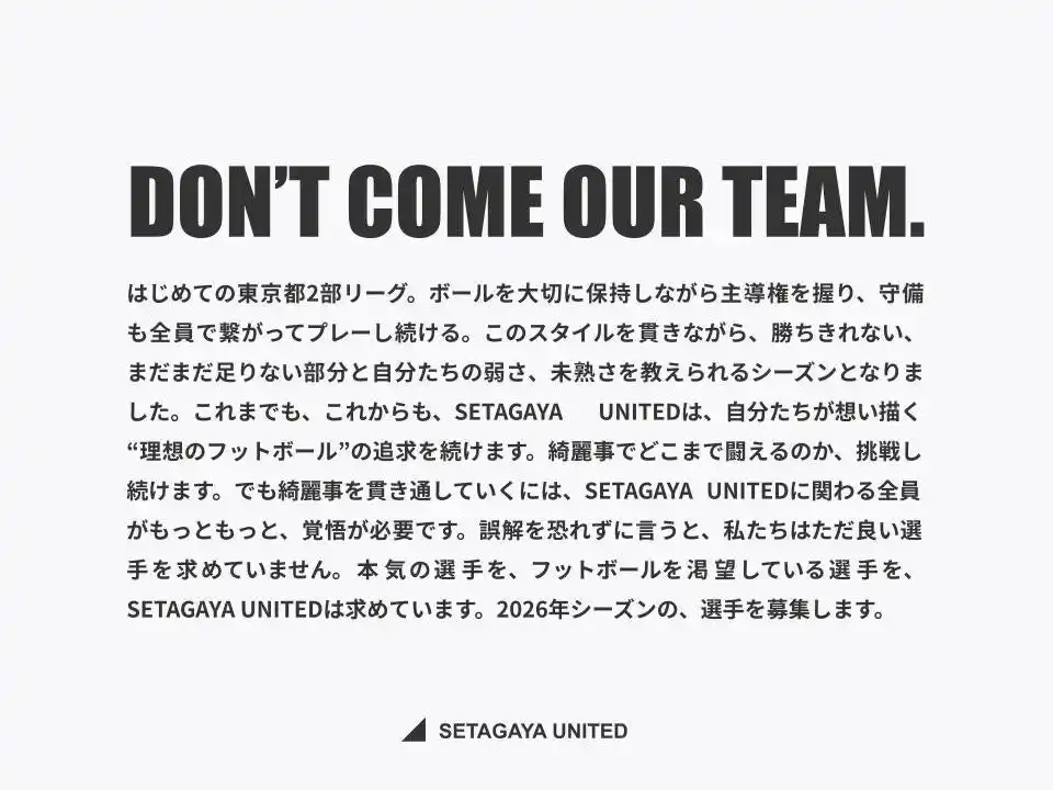 SETAGAYA UNITED、2026シーズンに向けた選手募集を開始。