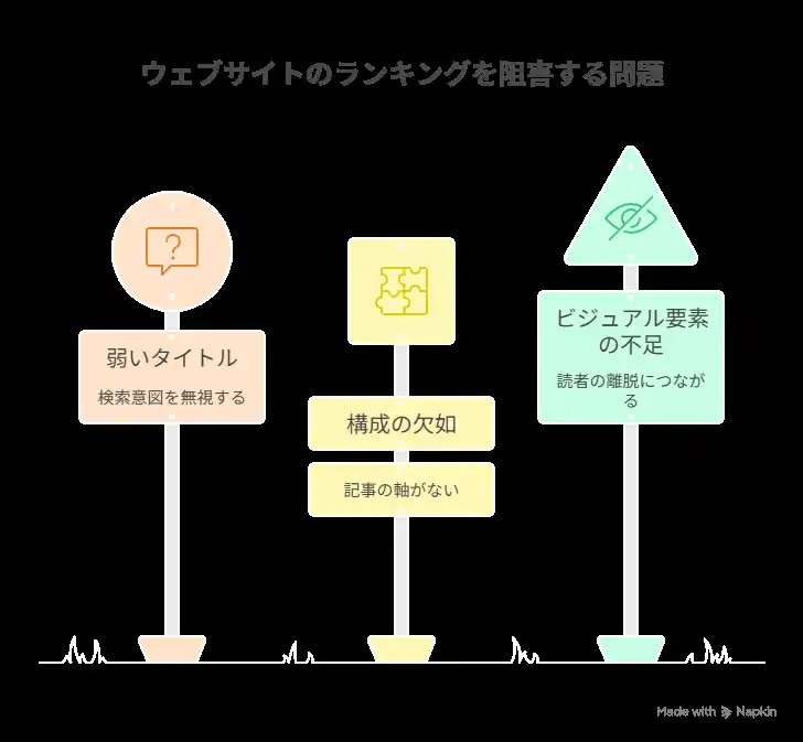 3. ビジュアル要素が不足している - 文字だけで延々と続く記事は、読者の離脱につながります。画像がない、表がない、箇条書きがない。こうした「読みやすさ」の工夫がないと、Googleのアルゴリズムも「このサイトの滞在時間は短い、ユーザー満足度は低い」と判断し、順位を下げていきます。 |