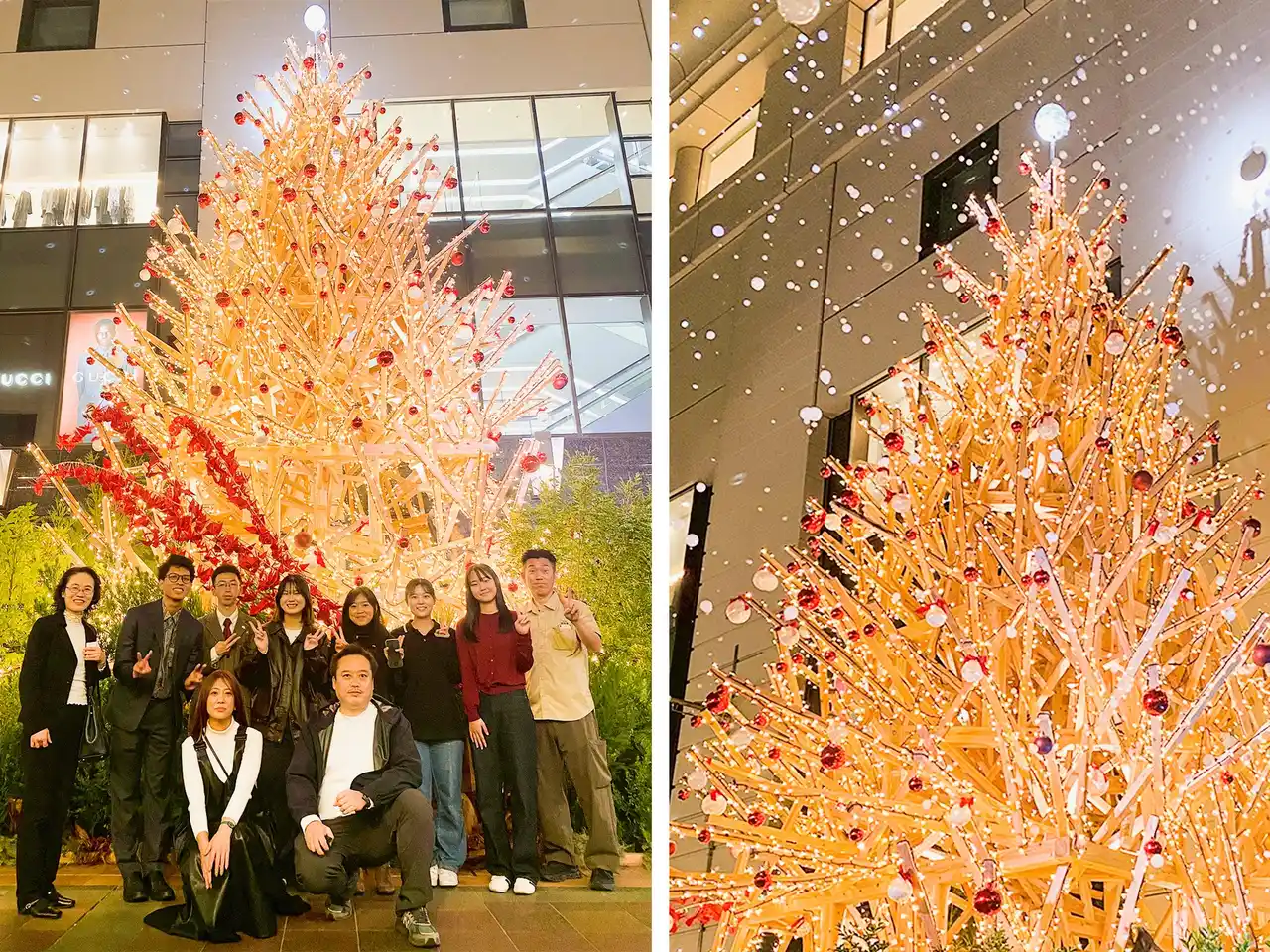 今年のクリスマスツリーは、大分の自然共生サイト「田島山業」が山林保全の一環として伐採した間伐材を活用。森の資源を無駄にしない循環のデザインとして、木の温もりを生かしたツリーが制作されました。灯りが重なるたび、森のいのちが“光”として未来へ受け継がれる象徴的なツリーとなりました。 |